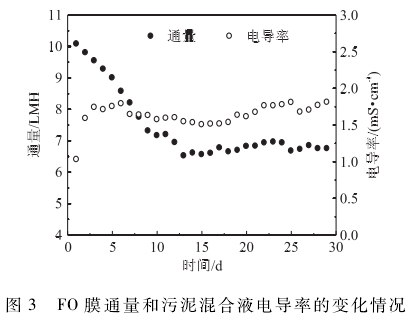 通量和混合液電導率隨時間的變化如圖3所示。由圖3可知,反應器內電導率在剛加入FO膜后,即有大幅度上升,這主要是由于反向鹽滲透。5d后電導率穩定在1. 7 mS / cm左右,這表明MF的引入成功實現了MFO-MBR的低鹽度環境。FO膜通量在初始運行階段,隨著時間的推移呈明顯下降趨勢,至第13天時穩定在6. 5 LMH左右,之后隨時間的增加通量相對穩定。需要指出的是,在整個運行過程中,MF膜的通量始終維持在11 LMH,未發生通量的衰減。在已有關于未引入MF膜的OMBR研究中,進水水質、汲取液種類及濃度和接種污泥均相同的條件下,TFC膜通量在第10天后穩定在3. 0 LMH,反應器內電導率增加至22 mS / cm。與之相比,本研究的MFO-MBR具有更低的鹽度和更高的運行通量。這說明MF膜的引入不僅可以使反應器維持在低鹽環境,而且由于鹽度的下降造成了FO膜運行通量的大幅提高。同時,與已有采用CTA材質FO膜的禍合MF膜的OMBR相比,在相同的運行條件下,TFC膜控制的鹽度(1.7 mS / cm左右)低于CTA膜(5. 0 mS / cm左右),這說明TFC膜比CTA膜具有更好的鹽度控制效果。