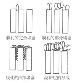 關(guān)于膜的污染機理目前研究中尚沒有統(tǒng)一的理論,但普遍認為,從微觀上膜污染是在范德華力以及雙電層作用下的大分子污染物和膜表面以及大分子溶質(zhì)間相互作用的結(jié)果。在范德華力和雙電層的作用下,與膜表面帶電性相同的污染物對膜的污染小,而帶電性與膜表面相反的污染物對膜的污染嚴重。從宏觀上講,濃差極化使得某些溶質(zhì)在膜表面的濃度超過其溶解度;同時水中微粒、膠體離子或溶質(zhì)分子與膜發(fā)生物理化學作用,使膜的透水量下降。濾餅層是大量微粒在膜表面逐漸累積而形成的覆蓋在膜表面的污染層,其會增加透過阻力,降低膜通量。膜的吸附是污染物與膜微觀作用的結(jié)果,是造成膜污染的關(guān)鍵。膜孔堵塞是由于污染物在膜表面或膜孔內(nèi)吸附或沉積造成的,其結(jié)果使膜孔窄化,導(dǎo)致膜通量下降。張國俊等〔30〕的研究表明,超濾除雜有3 種形式:(1)在膜表面的機械截留;(2)在膜孔中停留;(3)在膜表面及膜孔內(nèi)吸附。膜污染是由無機物沉淀、有機物吸附、顆粒物沉淀和微生物黏附生長及其相互作用引起的。膜孔的堵塞機理如圖 1 所示。