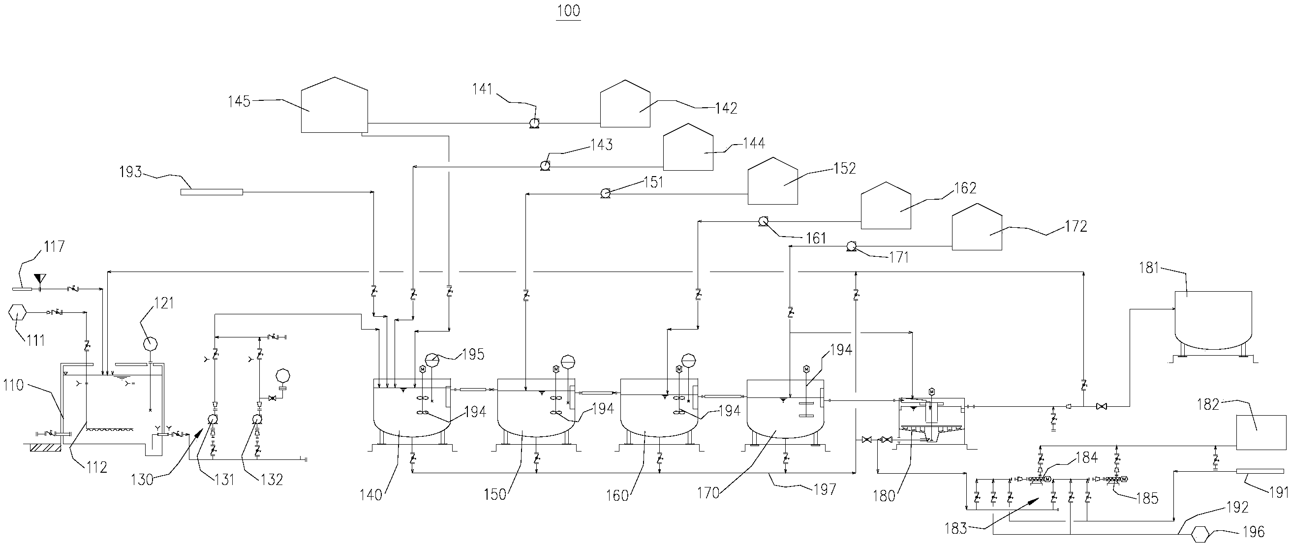 進一步地,在本實用新型較佳的實施例中,PH調節池、凝集池、第二PH調節池、絮凝池以及污泥沉淀池的內部均設置有自動攪拌裝置。