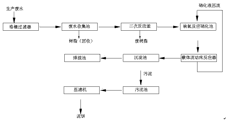 本實用新型的目的在于克服現有技術中存在的缺點,提供一種廢水處理裝置,該裝置不僅實現了廢水無害化處理,且通過二次聚合反應,以消耗掉廢水中游離態的酚離子和醛離子,以提升廢水的凈化效果,采用的技術方案是:一種酚醛樹脂合成用廢水處理裝置,包括廢水過濾部分,經所述廢水過濾部分過濾后的廢水進廢水收集池,其特征在于:所述廢水收集池連接二次反應釜,所述二次反應釜連接缺氧反應硝化池,所述缺氧反應硝化池連接載體流動床反應器,經所述載體流動床反應器處理后的廢水入沉淀池沉淀,分離出污泥的廢水流入排放池內。