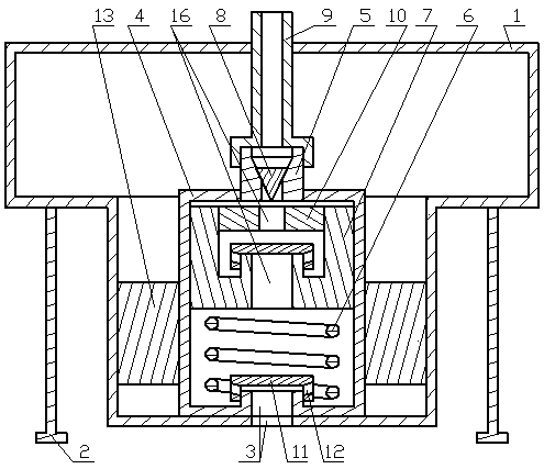 在進(jìn)水腔內(nèi)儲(chǔ)備污水待壓,在擠壓腔內(nèi)擠壓污水而產(chǎn)生水壓;在擠壓腔內(nèi)進(jìn)水時(shí),進(jìn)水腔與擠壓腔相通;在擠壓腔內(nèi)排污水時(shí),進(jìn)水腔通過密封錐與鐵芯活塞內(nèi)的內(nèi)錐孔密封而斷開進(jìn)入擠壓腔的進(jìn)污水通道;