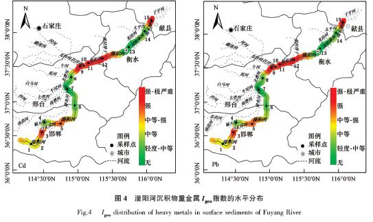 從Igeo指數污染水平分布(圖 4)可以看出,6種重金屬元素均存在不同程度污染.Pb和Cd為滏陽河中重金屬主要污染物,在研究河段有不同程度污染級別,其中Cd在邯鄲段下游和邢臺段洨河匯入點下游達到中等-強污染,在邯鄲段上游、邢臺段汪洋溝和邵村排干匯入點以及滄州段獻縣地區達到強污染,在邢臺段北澧河匯入點達到強極嚴重污染;Pb在邯鄲段上游靠近邯鄲城區和邢臺段北澧河的匯入點達到中等-強污染,在滄州段獻縣地區達到強污染;另外,Cu分別在邯鄲段上游和滄州段獻縣地區達到強污染;Zn在邢臺段邵村排干匯入點達到中等-強污染,在邯鄲段下游靠近邯鄲城區、邢臺段北澧河和汪洋溝匯入點以及滄州段獻縣地區達到強污染,在邯鄲段上游靠近邯鄲城區達到強極嚴重污染程度.