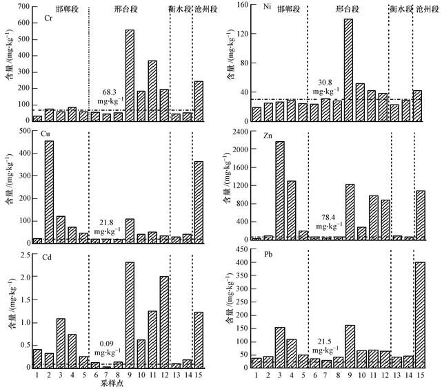100%,其中滄州段獻縣東賈莊橋村附近含量超標17倍.Cd污染次之,超標率93.3%,邢臺段北澧河和邵村排干匯入點含量超標24倍和21倍.Cu和Zn超標率分別為80.0%和66.7%,其中Cu在邯鄲段上游超標20倍,滄州段的獻縣地區超標15倍;Zn在靠近邯鄲城區(3、4號樣點)、邢臺段北澧河匯入點分別超標26倍、15倍和14倍.此外,從元素空間分布來看,Cr和Ni重金屬元素空間變化趨勢較為相似,邢臺段北澧河、洨河、汪洋溝、邵村排干的匯入點含量較高;Zn和Cd元素空間變化趨勢較為相似,靠近邯鄲城區以及邢臺段下游各支流匯入點處含量較高.
