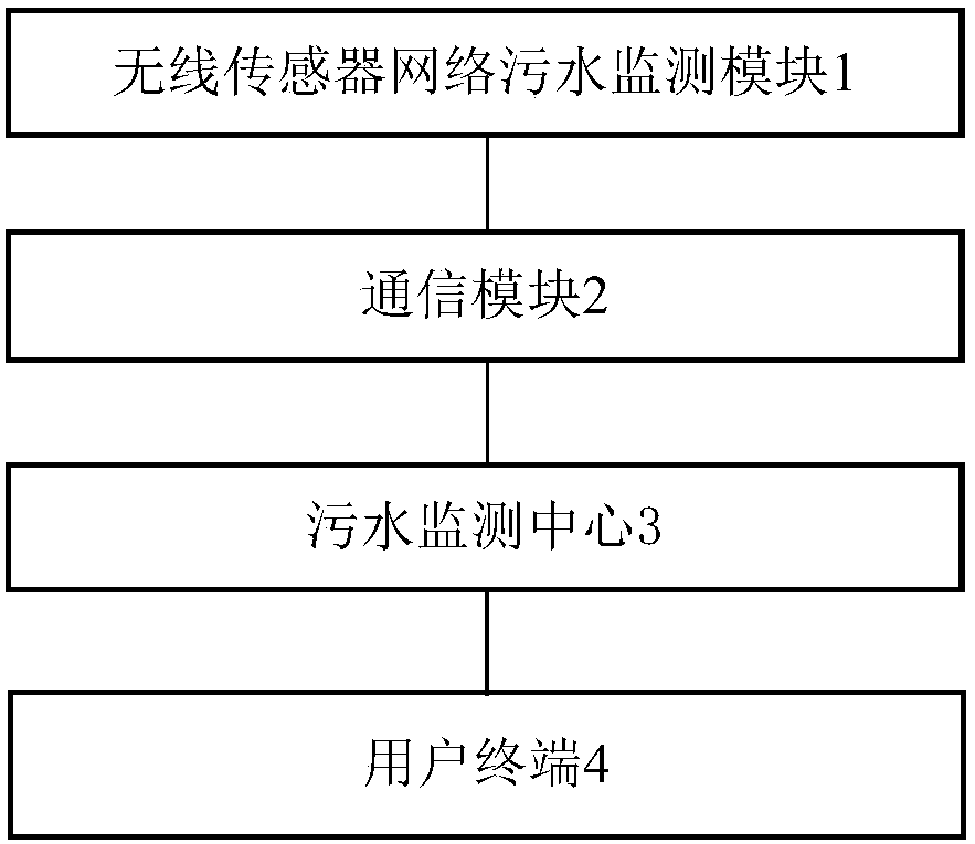 本發(fā)明的有益效果為:利用無線傳感器技術(shù)實現(xiàn)了污水的監(jiān)測,使得環(huán)保相關(guān)部門能夠及時發(fā)現(xiàn)水環(huán)境污染事故,對事故的發(fā)生和發(fā)展進(jìn)行監(jiān)測評估,制定緊急對策和措施。