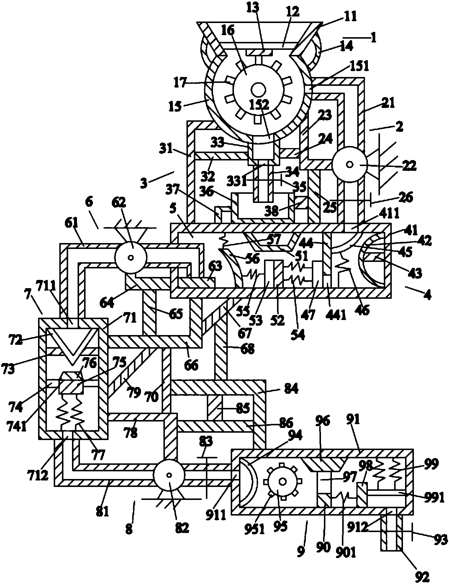 所述第四殼體呈空心的長方體且水平放置,所述第四殼體上設有位于其左表面的第八透孔及位于其下表面的第九透孔,所述第三連接管的下端對準所述第八透孔且與所述第四殼體的左表面固定連接,所述第六連接架與所述第四殼體的上表面固定連接,所述第四連接管的上端對準所述第九透孔且與所述第四殼體的下表面固定連接,所述第七過濾網呈空心的半球狀,所述第七過濾網的左表面與所述第四殼體的內表面固定連接,所述第七過濾網位于所述第八透孔的右側,所述第二滾輪呈圓柱體,所述第二滾輪與所述第四殼體軸轉連接,所述第二滾輪上設有若干凸塊,所述凸塊均勻分布在所述第二滾輪上且與其固定連接,所述集中塊的橫截面呈等腰梯形,所述集中塊的上表面與所述第四殼體的內表面固定連接,所述第八過濾網呈長方體且豎直放置,所述第八過濾網的上表面與所述集中塊的下表面固定連接,所述第二移動塊呈長方體且豎直放置,所述第二移動塊的下表面與所述第四殼體的內表面滑動連接,所述第二移動塊的上表面與所述第八過濾網的下表面滑動連接,所述第二移動塊上設有位于其右側的第七彈簧,所述第七彈簧呈水平狀,所述第七彈簧的左端與所述第二移動塊固定連接,所述第七彈簧的右端與所述擋板的左表面固定連接,所述擋板呈長方體且豎直放置,所述擋板的下表面與所述第四殼體的內表面固定連接,所述第六彈簧設有兩個,所述第六彈簧呈豎直狀,所述第六彈簧的上端與所述第四殼體的內表面固定連接,所述第六彈簧設有位于其下方的第九過濾網,所述第九過濾網呈長方體且水平放置,所述第六彈簧的下端與所述第九過濾網的上表面固定連接,所述第九過濾網的右表面與所述第四殼體的內表面滑動連接,所述第九過濾網的左表面與所述擋板的右表面滑動連接。