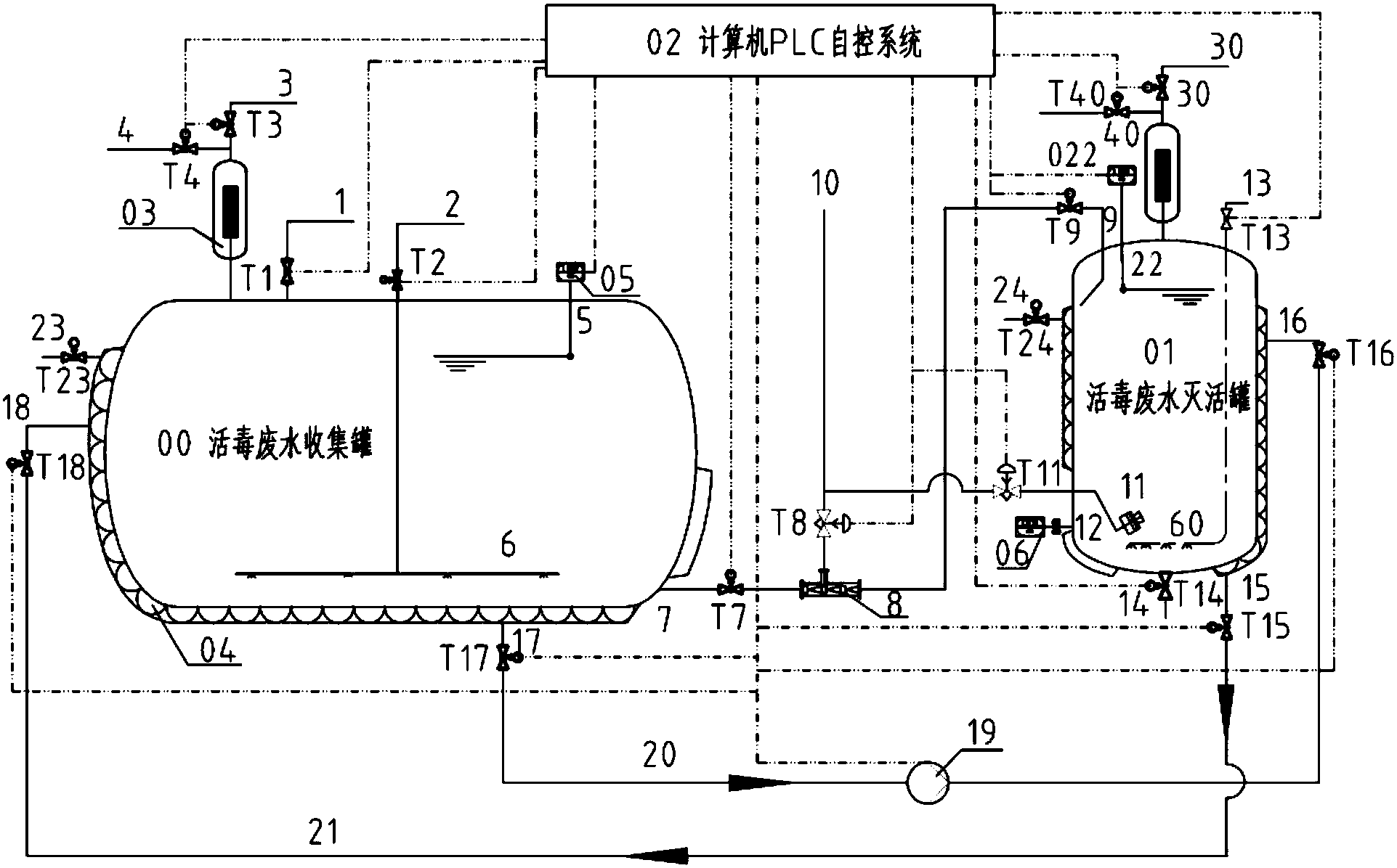 上述大規模生產活毒廢水處理系統冷熱能交換節能裝置還包括一計算機PLC自控系統(02),所述收集罐液位監測元件(05)、滅活罐液位監測元件(022)、溫度監測元件(06)、蒸汽預熱器(8)、蒸汽噴射閥(11)以及各閥門均電連接到計算機PLC自控系統(02)。