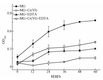 如圖 1所示,在空白實驗中(沒有重金屬Cr(Ⅵ)或者EDTA存在的條件下),即僅加入0.1 mmol·L-1的孔雀綠(MG)時,B. Cepacia C09G在前36 h快速生長,OD600接近了0.7,而后因為MG基本降解完,缺乏營養(yǎng)物質(zhì)生物量增長緩慢,60 h后比較終OD600值為0.78;僅加入0.5 mmol·L-1 Cr(Ⅵ),對微生物的生長有很強的抑制作用,生物量很低,僅為0.15;僅加入0.5 mmol·L-1 EDTA,毒性雖然比Cr(Ⅵ)更小,但仍有一定的抑制作用,60 h時OD600為0.31.據(jù)報道,EDTA和EDTA-Metal對土壤微生物都是有毒的(Grcman et al., 2001).當同時添了EDTA和Cr(Ⅵ)時,OD600為0.42,大于單獨加入Cr(Ⅵ)或者EDTA時,說明其生物毒性比單獨加入Cr(Ⅵ)或EDTA有所降低,因此,可以推測EDTA可以有效降低Cr(Ⅵ)的毒性.