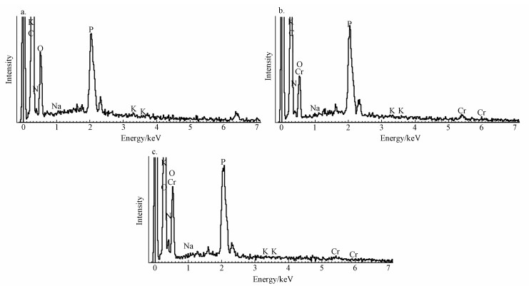 圖 6降解后Burkholderia cepacia的EDS圖(a. 0.1 mmol·L-1 MG, b. 0.1 mmol·L-1 MG+0.5 mmol·L-1Cr(Ⅵ), c.0.1 mmol·L-1 MG+0.5 mmol·L-1 EDTA+0.5 mmol·L-1 Cr(Ⅵ))