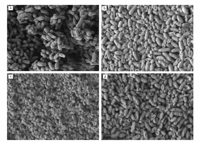 圖 5降解后Burkholderia cepacia的SEM圖(10000×)(a.0.1 mmol·L-1 MG, b. 0.1 mmol·L-1 MG+0.5 mmol·L-1 EDTA, c. 0.1 mmol·L-1 MG+0.5 mmol·L-1 Cr(Ⅵ), d.0.1 mmol·L-1 MG+0.5 mmol·L-1 EDTA+0.5 mmol·L-1 Cr(Ⅵ))