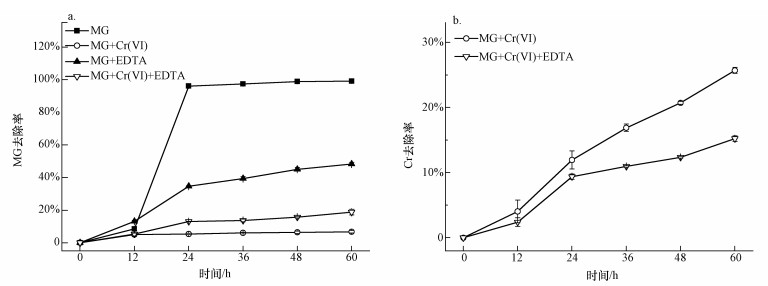 圖 2a為不同條件對孔雀綠的降解影響,在僅加入0.1 mmol·L-1 MG的情況下,MG在24 h的去除率達到96.2%;只添加0.5 mmol·L-1 Cr(Ⅵ),60 h時MG的去除率均為6.7%,單獨添加0.5 mmol·L-1 EDTA時,60 h時MG的去除率為48.4%,說明Cr(Ⅵ)和EDTA均會抑制B. Cepacia C09G對孔雀綠的降解.同時添加EDTA和Cr(Ⅵ)時,60 h MG的去除率上升到18.8%,相對于單獨加Cr(Ⅵ)的降解率有所提高,可以看出,EDTA確實可以有效地降低Cr(Ⅵ)的抑制作用,從而提高對孔雀綠的降解效率.也有研究證實,加入EDTA可以降低5 μmol·L-1 Cd、Cu和Zn對細菌Escherichia coli的毒性(Campbell et al., 2000).