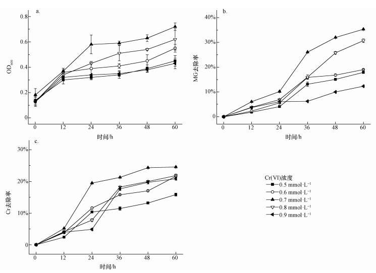 將已算好體積的藥品加入降解培養(yǎng)基中,每支玻璃離心管(無菌)中加入15.0 mL的降解培養(yǎng)液,再加入菌液(初始OD600=0.7,體積比6%),塞上棉花塞,放入搖床(150 r·min-1,30 ℃)培養(yǎng)0、12、24、36、48、60 h后分別測定OD600、MG和Cr(Ⅵ)濃度.上述每個試驗均做3個平行,結果取其平均值,并計算標準偏差.