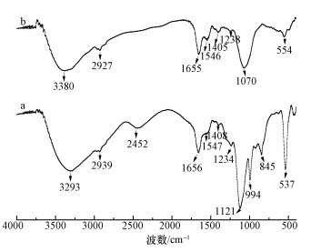 圖 7為菌株B. Cepacia C09G吸附孔雀綠及孔雀綠和Cr(Ⅵ)后的FTIR光譜圖.由圖 7可知,2939~2927 cm-1處的峰是—CH、—CH2及—CH3的不對稱振動峰,在1655 cm-1和1546 cm-1處出現(xiàn)由氨基酸I的—NH2與氨基酸II的—COOH形成的—NH/CO的伸縮振動吸收峰,1408~1405 cm-1處分別為孔雀綠及降解產(chǎn)物芳環(huán)上的C=C的伸縮振動峰和O—H的彎曲振動峰.圖 7b相比于圖 7a,在2452 cm-1和845 cm-1處的峰消失,1070 cm-1處峰的產(chǎn)生是由于氨基酸的—NH轉(zhuǎn)變?yōu)镃=N共軛鍵.這說明菌株C09G的去除過程主要是—OH、—COOH、—NH2、—NH/CO等官能團與Cr相互作用(Nandi et al., 2009).