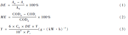式中:A0為溶液的初始吸光度;A為處理時間為t時溶液的吸光度;V為處理液體的體積(mL);P為輸入功率(w);t為處理時間(min ) ; C0為溶液的初始濃度(mg /L) ;COD0為初始化學需氧量(mg /L'),CODt為處理時間為t時的化學需氧量(mg /L)。