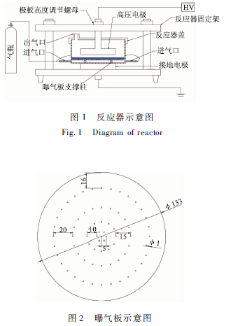 實驗采用圖1所示的石英DBD反應器,外徑140mm,內徑134 mm,高度100 mm,底板厚2 mm,內部有4個長度為15 mm直徑為6 mm的石英柱8固定在反應器內壁用來支撐曝氣板。反應器壁上有2個石英制成的進氣管3,實驗氣體(空氣,O2)由2個進氣管進入反應器。