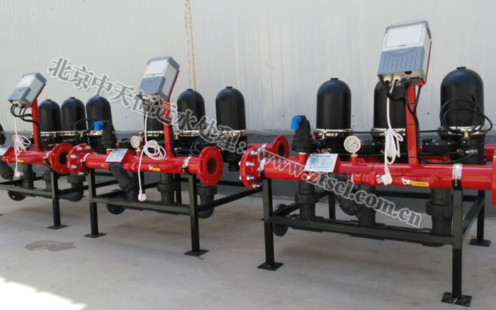 過濾器反洗的啟動采用時間和壓差同時控制,工作時間和反洗時間的設定都可現場調整。當壓差或時間達到設定值時控制器按一定順序逐個啟動反洗,清洗完畢后立即投入使用。控制器設有強制反洗功能,并且通過調節電磁閥上的手動控制鈕實現對每個過濾頭的手動控制。